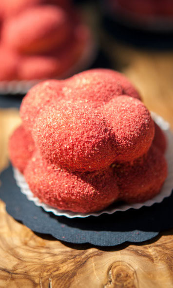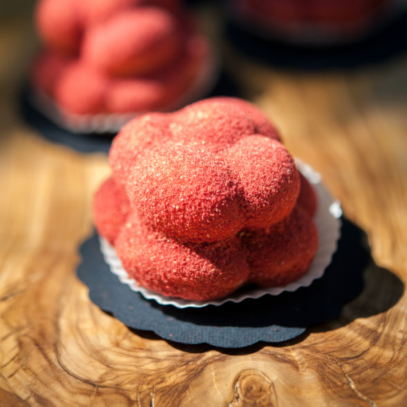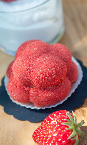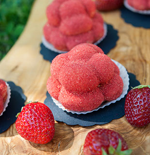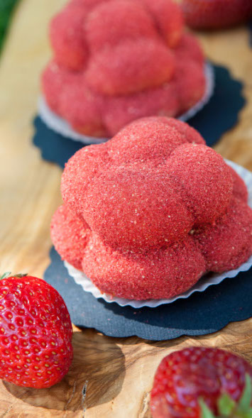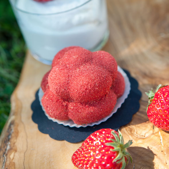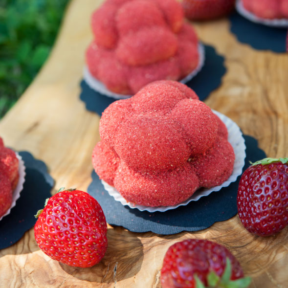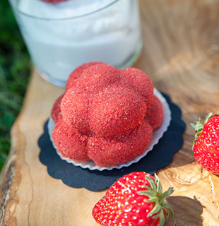 Der bekannte Bollenhut aus dem Schwarzwald war Inspirationsquelle für das Erstlingswerk von Milch trifft Mehl: Ein süßer Kuchen aus Quarkmasse umhüllt von fruchtigem Erdbeerstaub.